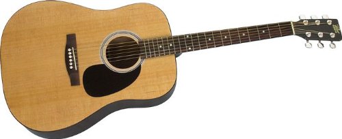 A marvel for its price, the traditional dreadnought design makes for one very playable guitar with a great, full tone. Perfect for strumming or fingerpicking any style of music, it's no wonder this guitar has been so highly rated by our customers. Features a genuine spruce top, die-cast tuning machines, 25-1/2" scale nato neck, and bound rosewood fretboard. It's easy to tune and stays that way. Rich, resonant sound and excellent projection and intonation make this a first guitar to be proud of. It's also great for camping or as a second guitar. Each guitar ships with genuine Martin strings for a quality sound right out of the box. Check the drop-down menu to the right to select colors and/or other options.